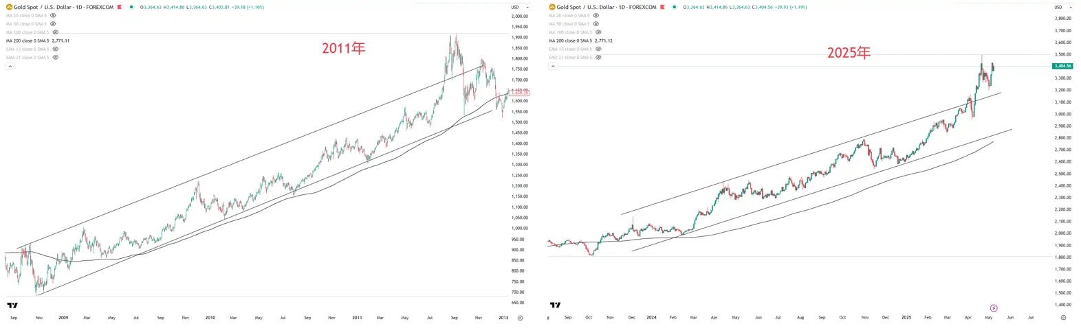 黄金走势2011 vs 2025   来源:Tradingview
