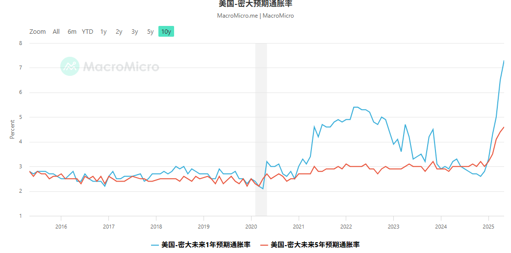 中美关税“休兵”是一段时间以来市场最大的利好,加上美国4月CPI低于预期,令美国经济衰退的概率显著降低。不过周五的数据显示,美国消费者信心指数连续第五个月下滑创近三年新低,密歇根大学一年和五年的通胀预期大幅飙升(下图),这提醒着投资者,关税战以及后续影响仍然充满不确定性。